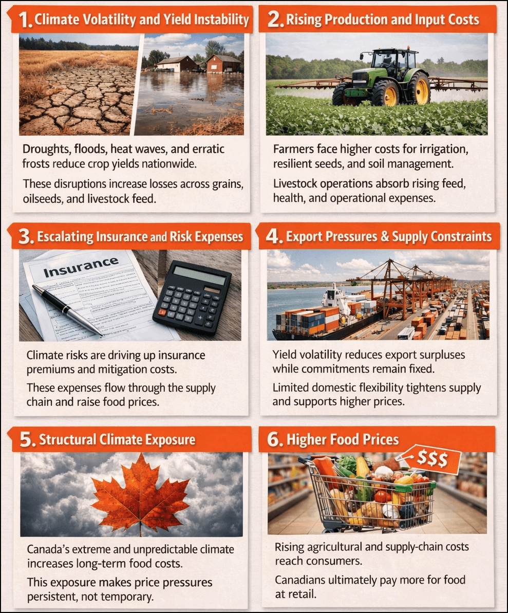 By embedding climate risk into production economics, Canada’s agricultural sector is reinforcing long-term food inflation, making climate resilience a central challenge for stabilizing future food prices.